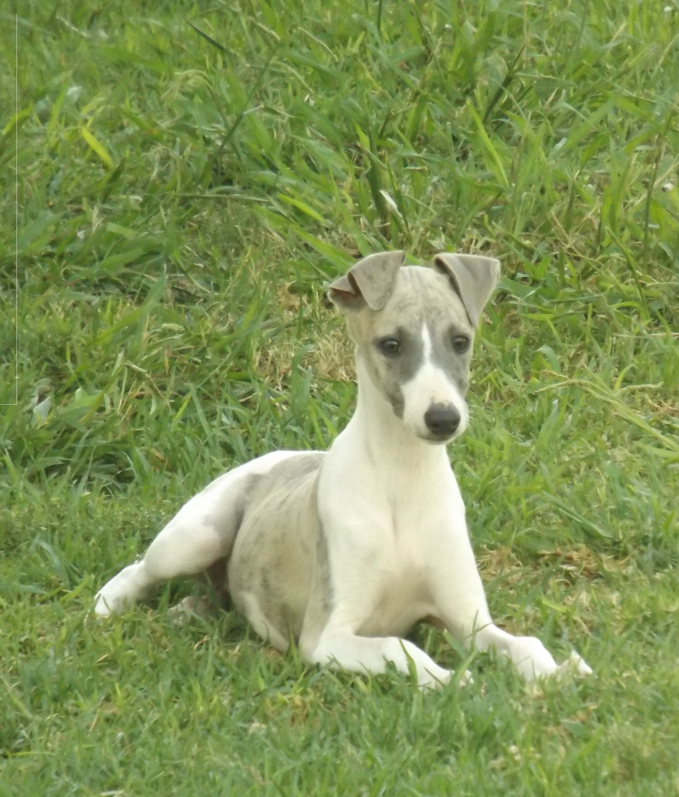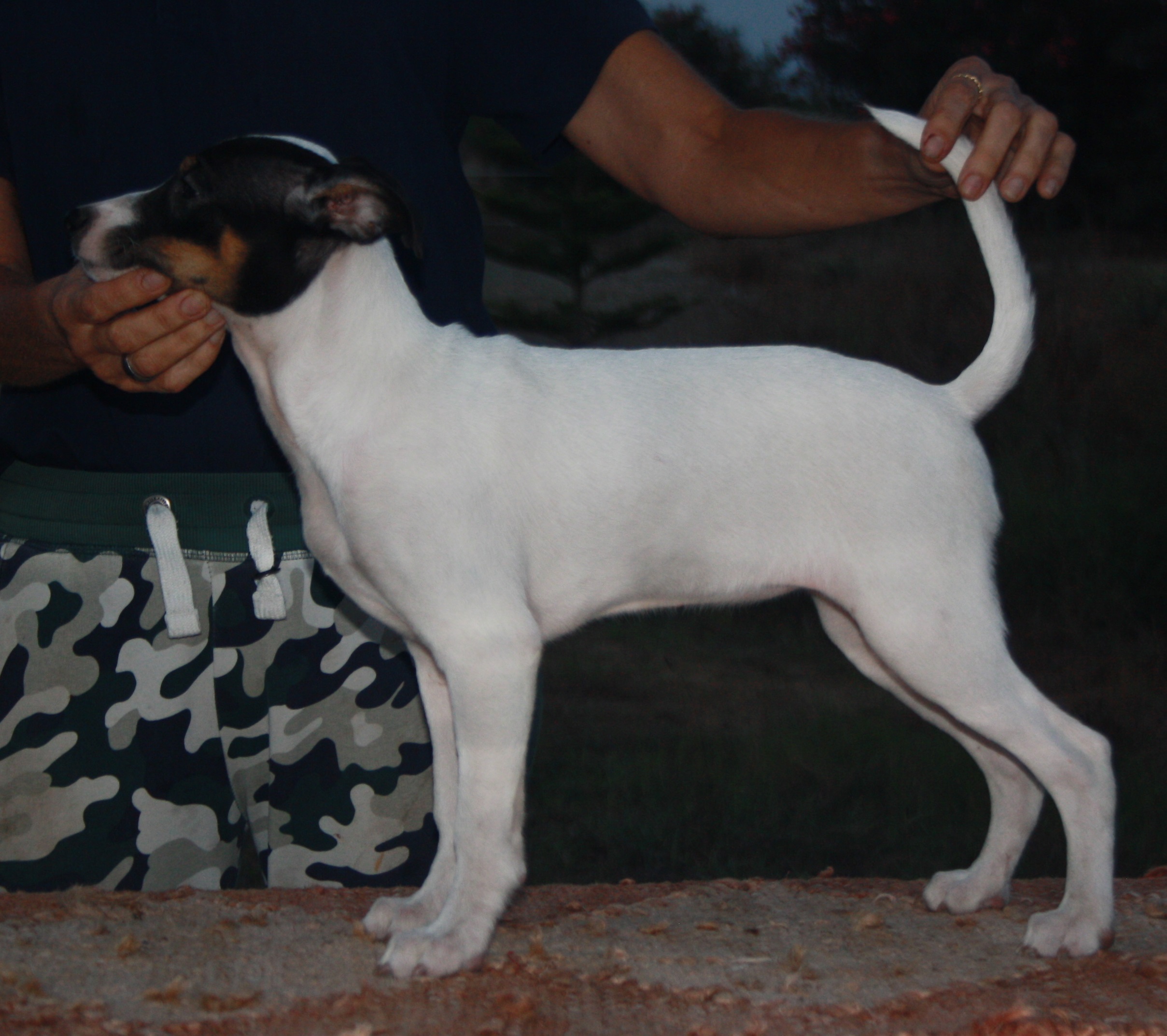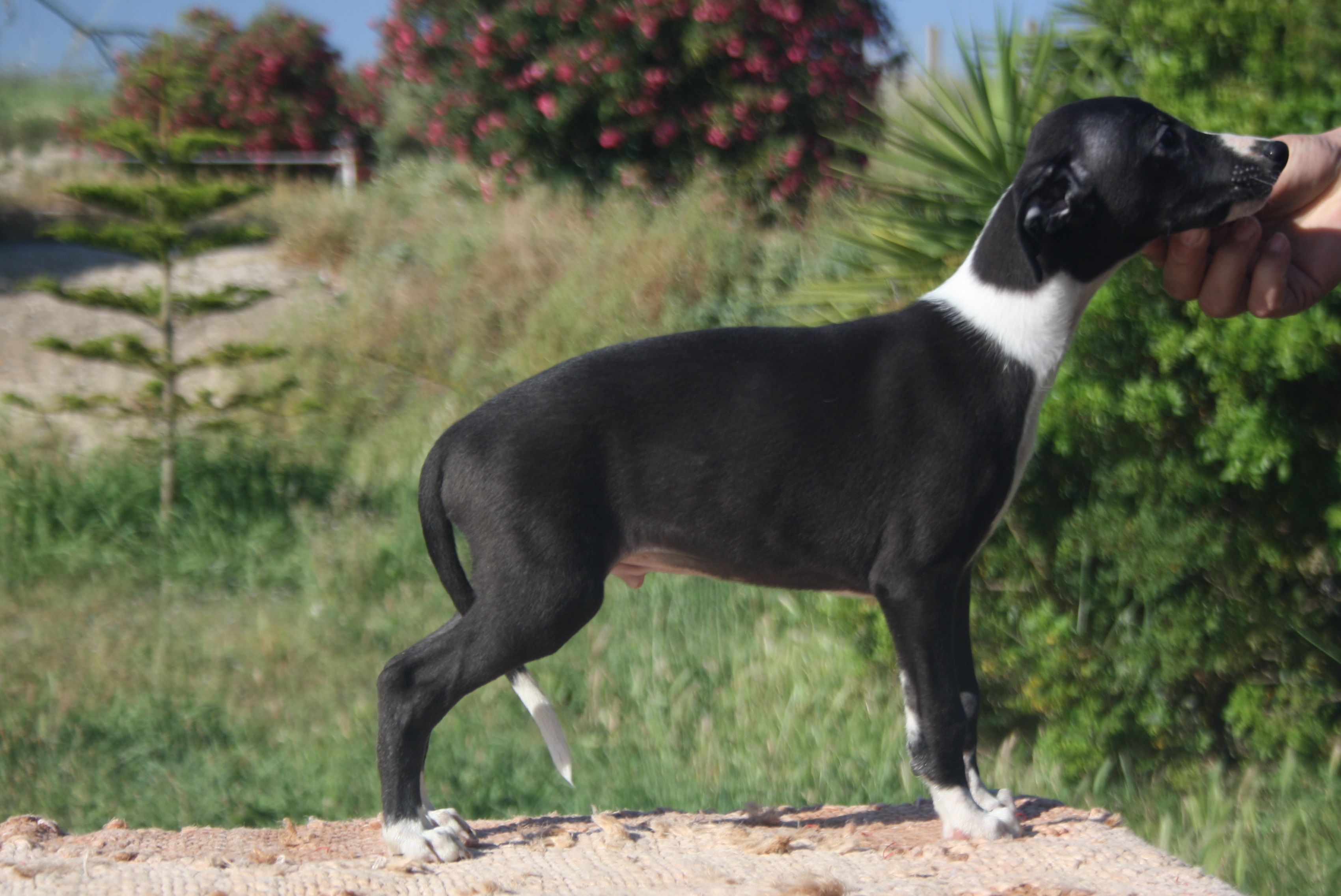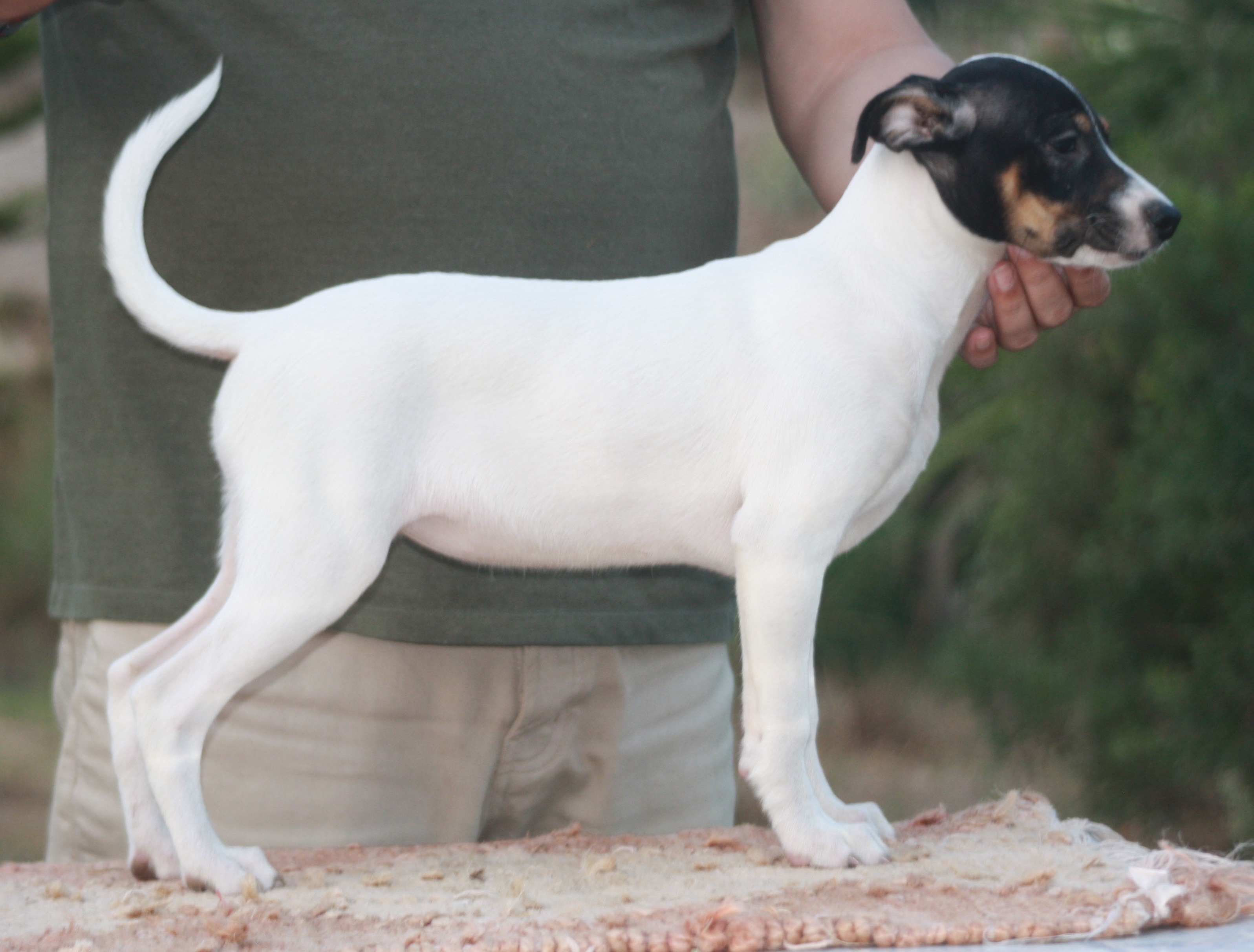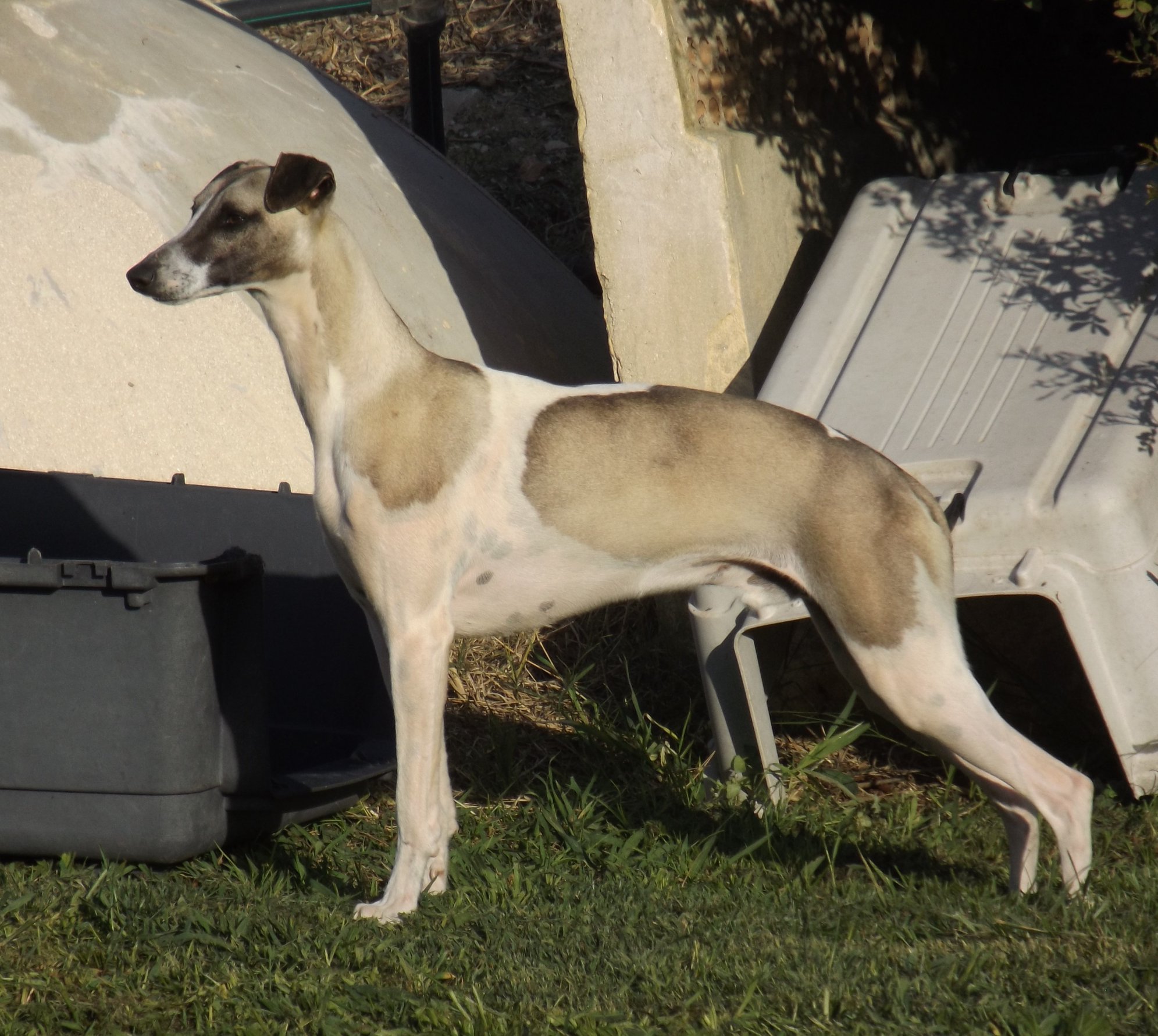 Nuestra base de cría parte de ejemplares con sangre americana e inglesa, el tipo de genealogía que criaba Jackie Bourdin ( Du Manoir de la Grenouillere ) en Francia, con adición de un porcentaje algo mayor de sangre canadiense y americana. Hoy en día es el tipo de whippet que vemos mayoritariamente a nivel continental. Para mí el reto es criar un perro con tipo y movimiento americanos en un formato algo más reducido. Durante muchos años huimos de la tosquedad del whippet inglés, pero éste evolucionó últimamente muy favorablemente hacia la elegancia del americano gracias a cruces con ejemplares importados, de forma que hoy podemos disfrutar un tipo consistente casi a nivel mundial.