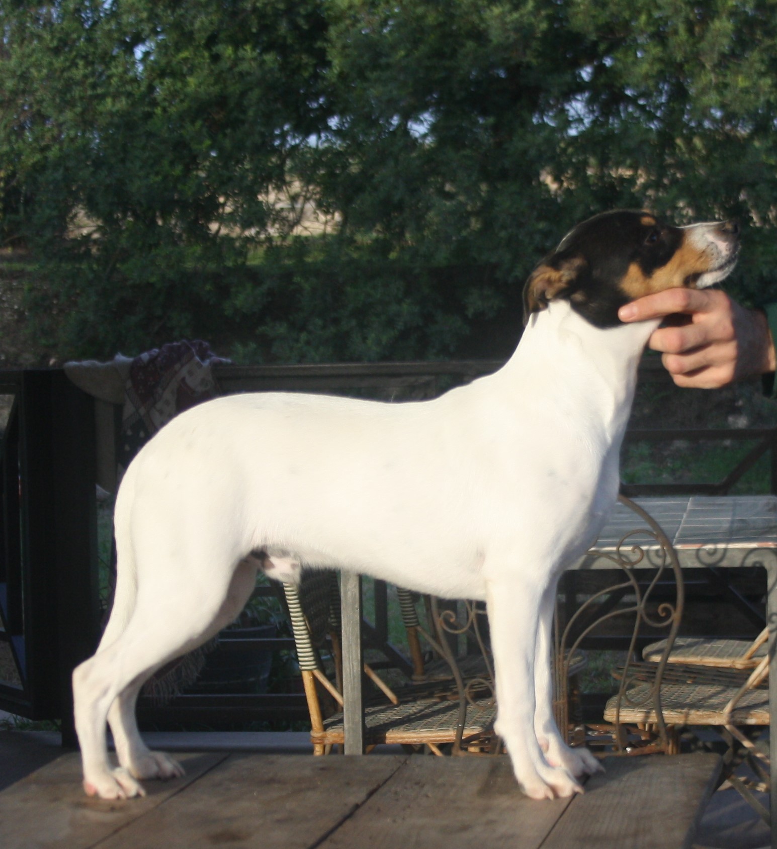 Nuestro primer whippet vino por casualidad, en una época en que empezábamos a introducirnos en el mundo de las exposiciones caninas con galgos afganos. Nuestro mentor, John Hansen, recibió también por compromiso de amistad perras del afijo Do Vale Negro, de Carla Molinari ( Portugal ) y nos regaló un perro de su primera camada en el 95, Jahrog All In One ( aka Hugo). Hugo fue todo lo que un propietario de un perro de show puede esperar, con grandes triunfos en los rines de belleza, y el introductor de la raza en nuestra casa. Desde entonces ( y hasta el final ) siempre habrá whippets en casa. Entonces era una raza prácticamente desconocida en nuestro país, hoy son bastante populares. Todo el que se acerca a la raza termina hechizado por su belleza y su carácter, para mí es la mejor raza del mundo porque tiene todas las ventajas y ninguno de los inconvenientes inherentes a cada raza. Extrovertidos, elegantes , limpios, saludables, fáciles en todo. Desde el fallecimiento de Stephen Mason ( Broadacres whippets ), somos el kennel más antiguo de la raza en España.